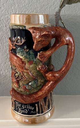 VINTAGE GERMAN BEER STEIN DIE GRUNE HEID WITH FOX HANDLE
