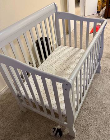 Sturdy standard size white baby crib with mattress. Upgraded mattress. Great shape!