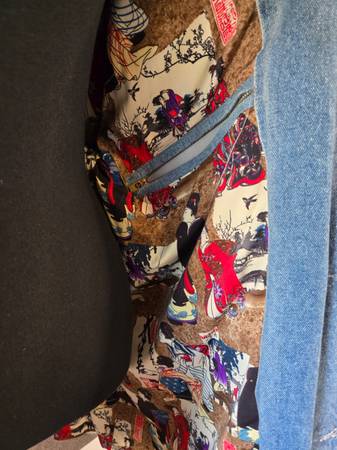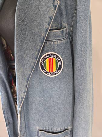 Front of denim jacket includes an embroidered Vietnam Veterans of America patch. The back includes a screen print of the Wounded Warrior Project; Certification of Recognition for George Louis Buscaglia. Kimono print lining added at a later date. Jacket shell looks to be early 1990's/2000's. Brand: No label Custom interior lining