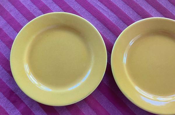 LOT OF EIGHT (8) GOOD USED CONDITION WAECHTERSBACH SOLID BRIGHT PRETTY MUSTARD/SUNSHINE/BUTTERCUP YELLOW 8” SALAD/DESSERT/SNACK PLATES