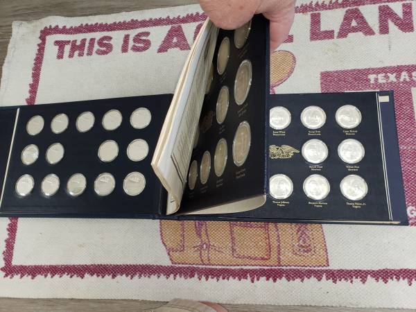 Selling an estate collection of Franklin Mint sterling silver medallion sets. Total silver weight is approximately 201.368 troy ounces. Serious buyers can come to my office to inspect the sets - I'm not toting these around the metroplex to meet in public places. All the medallions, coins, bars, rounds, etc in this collection are solid sterling silver (92.5% pure) - no plated or other such items.