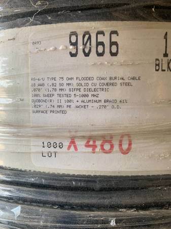 I am selling here 4 1000' rolls of Belden cable. These are new unsed rolls that I have had for years and dont really know why I got them. I dont know much about this cable, but here's what I got. There are 2 rolls of coxial cable type 75 in 2 sizes .270 od and .486 od. The .486 has a ground wire on the side as well. The other 2 rolls are 6 and 8 wires inside the cable.