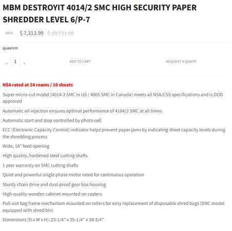 • New: $7,313.99 + tax (www.destroyitpapershredders.com/products/destroyit-4014-2-smc-high-security)