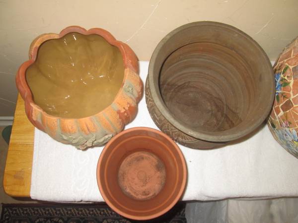 $20 for 4 Terracotta Clay Vases NO HOLE for drainage, one is Mosaic Vase 4.5 Gallon size10"H 12" w Terracotta clay pots 7.5"h 10" wide Terracotta clay with bird graved decoration 9"h 9.5" wide...