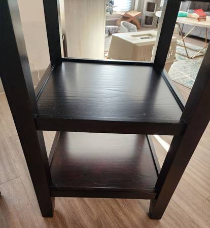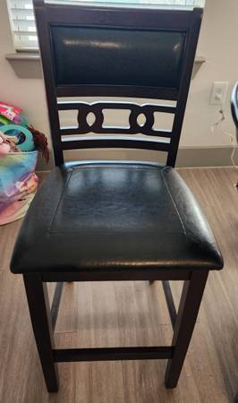 Perfect for apt living. Great condition. The white specks on the back of 1 chair is due to exposure to moisture. I never even noticed until I was preparing to photograph. Sturdy wood with espresso...