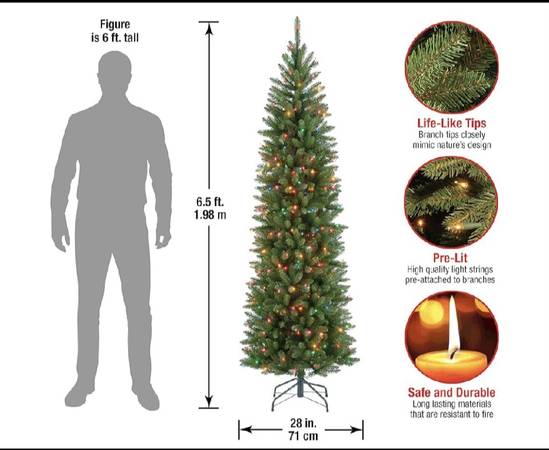 * This Kingswood Fir Slim Pre-Lit Artificial Green Christmas Tree is 6.5 feet tall with a 28 inch base diameter. Featuring hundreds of individually crafted branch tips to create full bodied branches, this tree is designed to look and feel lifelike.