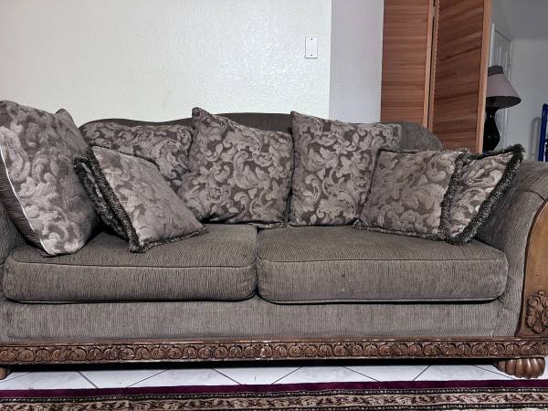 This set has a classic, high-end look – warm honey/golden wood tone with carved details, scroll legs, and fluted feet. The sofa is upholstered in a neutral taupe/brown fabric with coordinating patterned pillows, so it blends easily with most décor (traditional, Mediterranean, Tuscan, etc.).