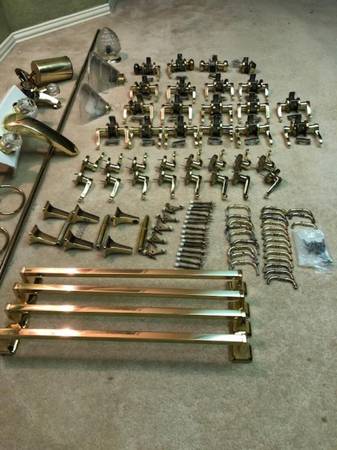 Misc lot of brass door handles, drawer pulls, lights, towel racks, toilet tissue holders, faucets, and door stops