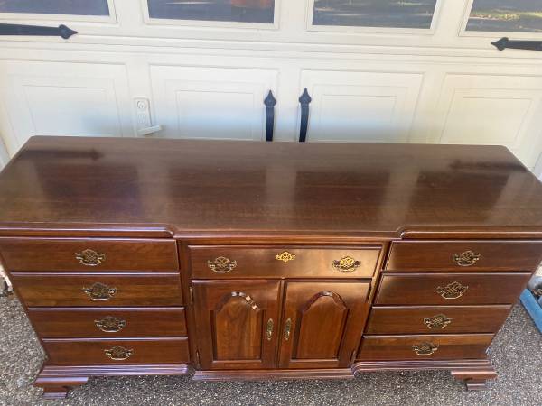 Beautiful cherry dresser or console in good condition. Solid wood construction. Quality made by Jamestown Sterling Furniture. Dresser has 12 drawers, all are dove tailed (front and rear) and work properly. Top right drawer has wood valet tray. Nice brass hardware. Solid and sturdy. Top surface has a few minor blemishes.