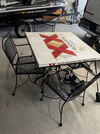 For sale an outdoor patio table and chairs. Very sturdy table with Dos Equis top. Asking $100 or best offer. Call or text for more info Kevin 5o5-5o4-258l