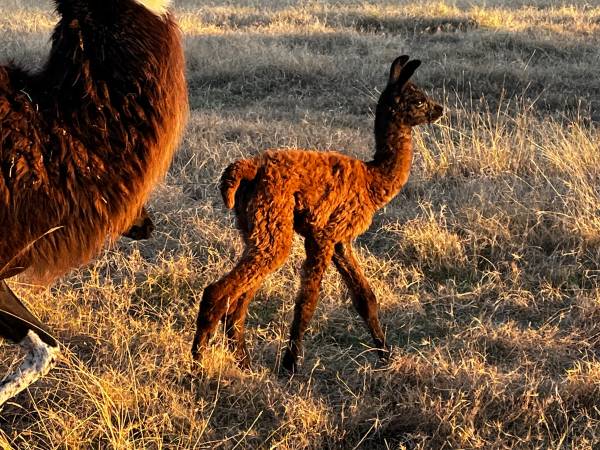 This female cria was born on November 14, 2025, and deposits are now being accepted. This dark-colored little gal has an extremely dark reddish-brown body with a black head and black coloring on her neck -- very striking!