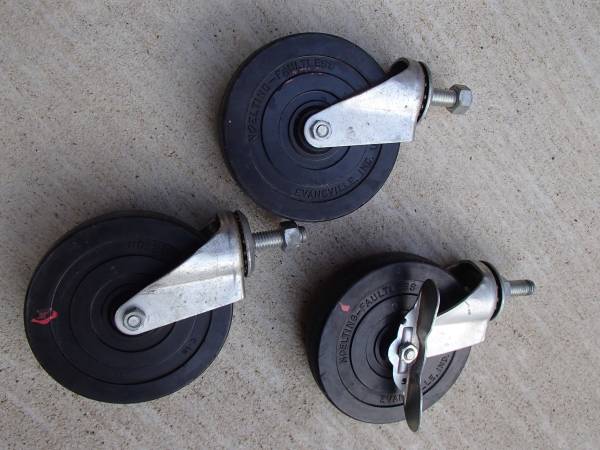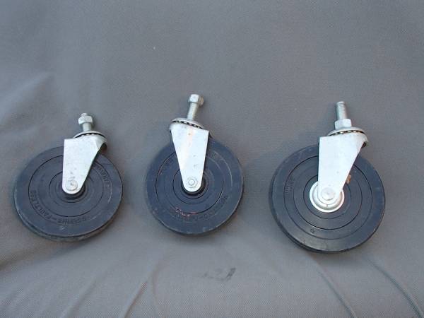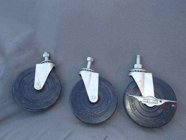 3 Caster Wheels for Cabinet or Bench with hardware. Black in color for wheels. The wheels are 5" in diameter and 1" thick