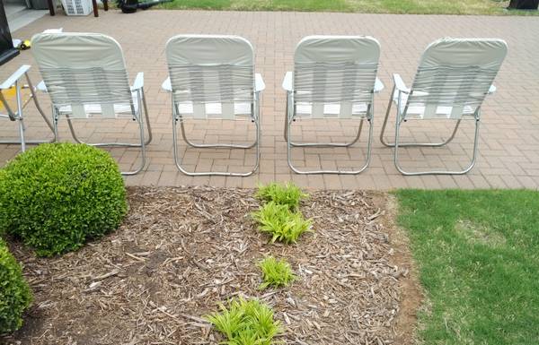 SET OF 4 GRAY AND WHITE FOLDING LAWN CHAIRS FOR SALE FOR $88 - Set of 4 Gray and White Folding Lawn Chairs with Rolled Plastic Strapping Backs and Seats. The 4 Lawn Chairs are nice quality, durable, and in very good condition. There is some pitting to the metal on the bottom frames.