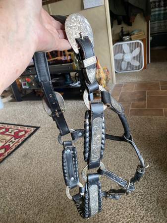 Beautiful yearling size show halter for sale. Has lots of silver on it. Comes with a leather lead and chain. Great condition. $75.00 cash only, or take trades for western saddles tack and trailers....