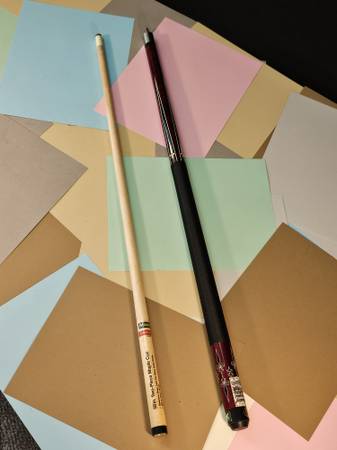 Open box condition with factory labels still on the butt and clean tip; appears unused. Breaks down into two pieces for easy transport and storage.