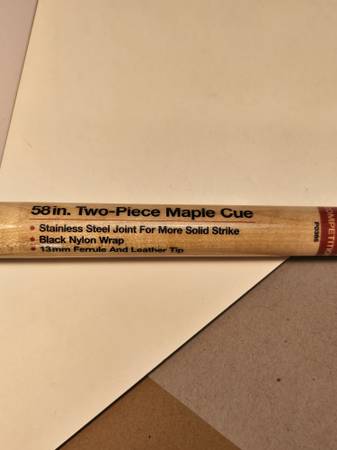 Mizerak Competition two‑piece maple cue, overall length 58 inches. It features a stainless steel joint for a solid strike, a black nylon wrap for grip, and a 13 mm ferrule with leather tip. Classic red/black butt with fleur‑de‑lis style accents.
