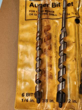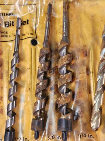 Vintage Sears Craftsman Auger Bit Set in original yellow roll-up pouch. For wood, compatible with a hand brace or 3/8 in. to 1/2 in. electric drill. Contents are marked Made in Japan.