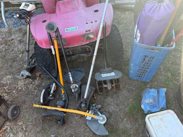 Various weed eater attachments, new gang boxes, box of alumni roofing nail,.. electric trolling motor,