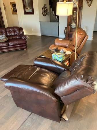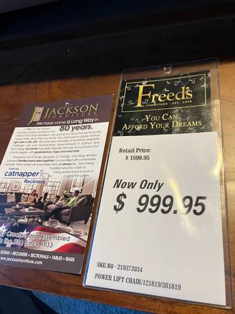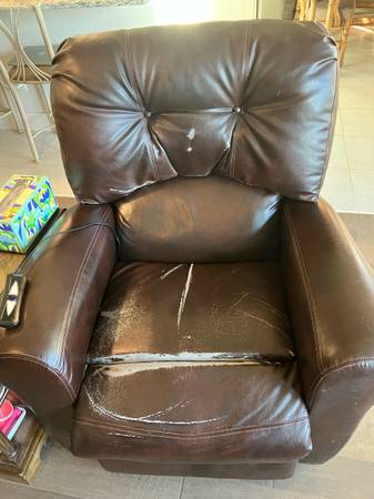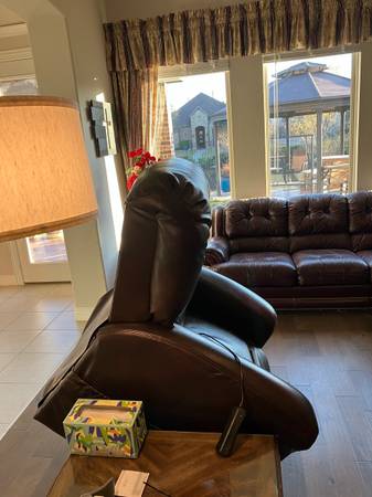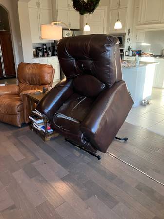 This Catnapper lift chair raises a person as high as necessary to stand up without falling. Reclines with remote control and the motor runs so quietly you cannot hear it. The coating on the leather (which is paper-thin) is wore off a little bit, but the leather is ineffective. No tears, stains, or worn through places. Large enough for the biggest person.
