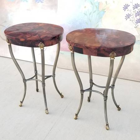 Set of 2 Ethan Allen Hollywood Regency Style Period Faux Tessellated Horn over Faux Tortoise shell Wood Oval Side or Accent Table.