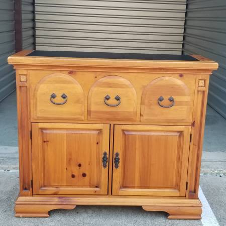 This Amazing piece shows so well with very unique dome style 3 upper cut drawers. Large side by side bottom drawers with spacious interior for storage of you fine China, flatware and tableware.