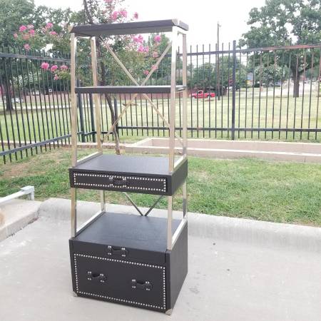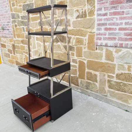 Versatile and multi purpose, it's a shelving unit / book nook, etagere with integrated storage drawers, designed in a style reminiscent of vintage travel trunks or luggage typical of Restoration hardware and other classic designs. It features a dark leather finish with metallic accents and studded detailing.