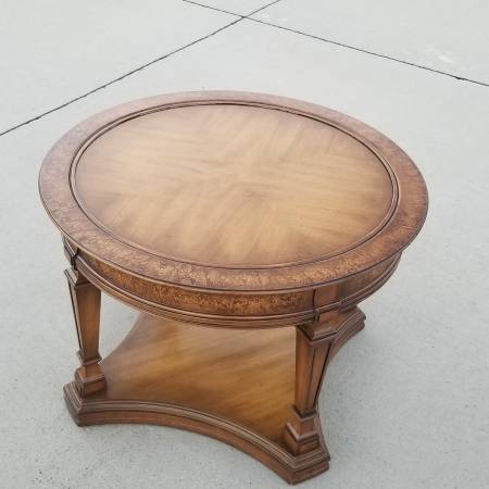 This table is a classic elegant design vintage Weiman multi functional round pedestal table, similar to a "drum table" style. It feature a round top with a pedestal base with subtle sunburst burl inlaid pattern details.